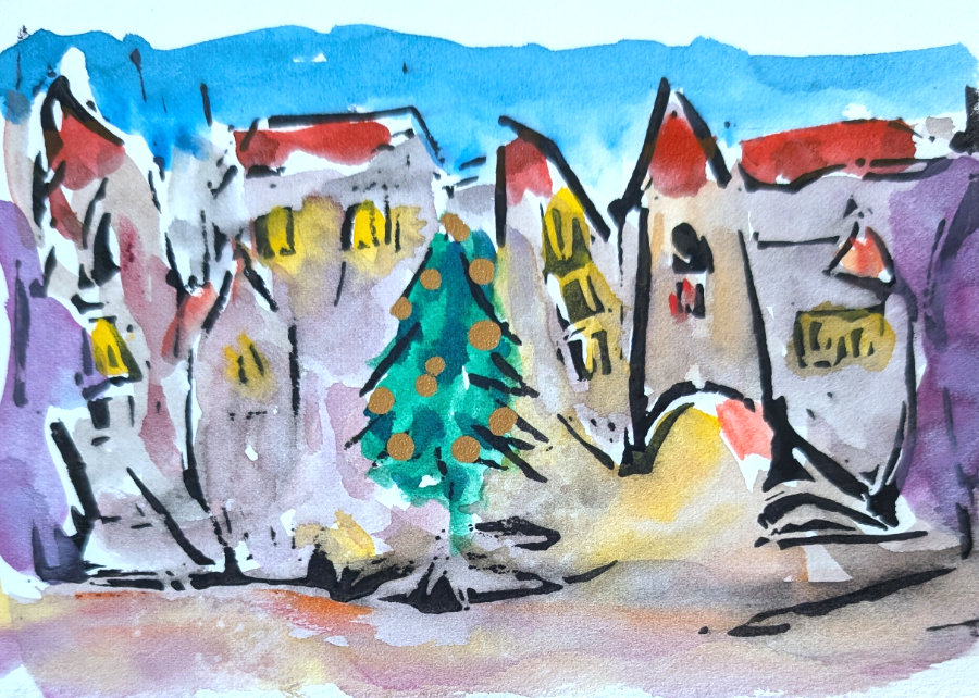 Weihnachtskarte Baum vor der Stadt